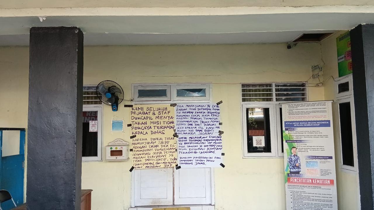 Halsel. Dodominews.com- Pantauan media di Kantor Dinas Kependudukan dan Pencatatan Sipil (Dukcapil) Halsel, sejumlah poster berisi pernyataan sikap berupa mosi tidak percaya terhadap pimpinan dinas terlihat terpampang di area kantor, Jumat, 23 Januari 2025. Poster-poster tersebut ditempel di pintu bagian depan kantor.